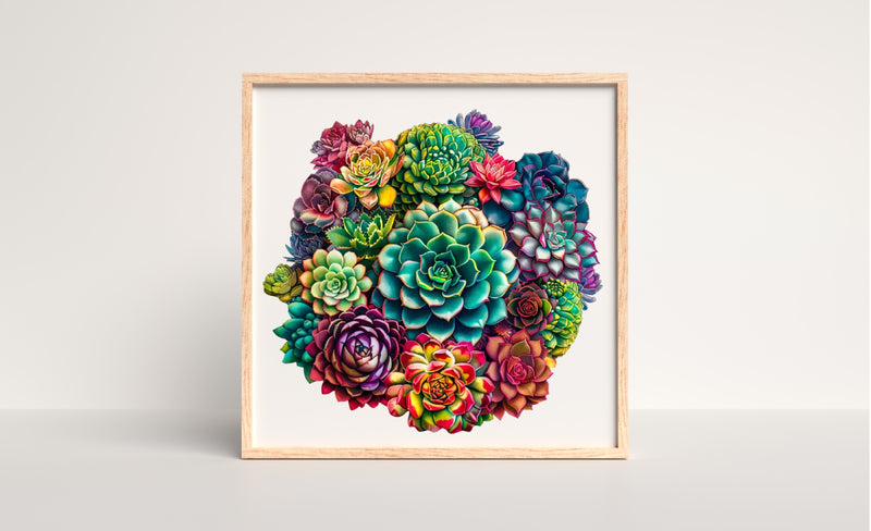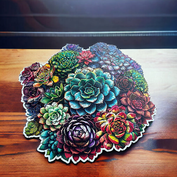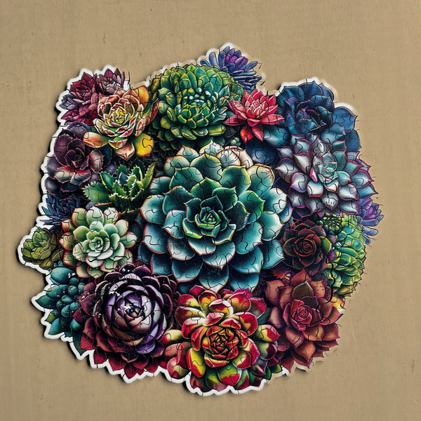 パズルを組み立てていくと、ロゼットやサボテンなど、様々な多肉植物の形をしたピースが見つかります。