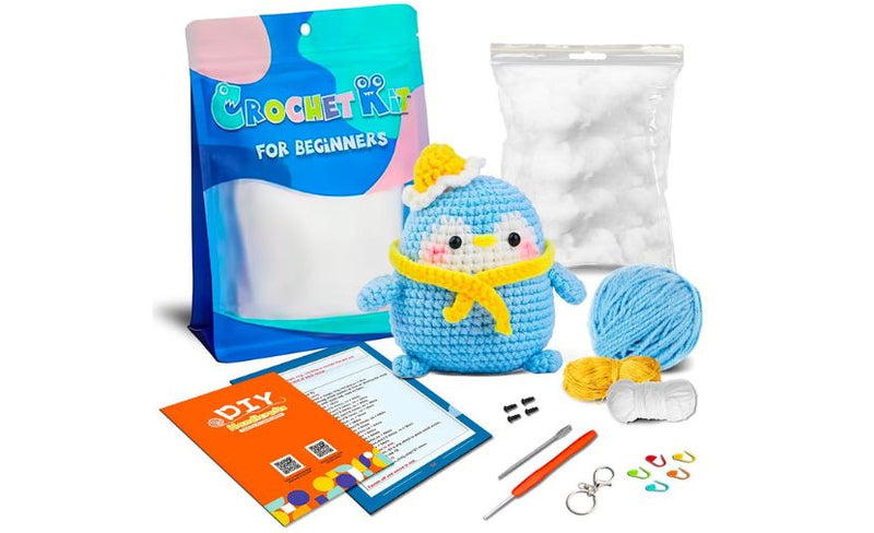 このオールインワンのかぎ針編みスターターキットには、両先かぎ針、段数マーカー、目を付けるための針、あみぐるみの目、柔らかい詰め物、各種毛糸、総合ガイドブック、そしてセット一式を収納できる便利な携帯用ポーチが含まれています。