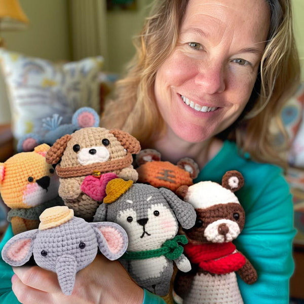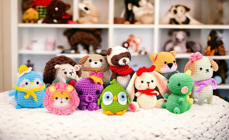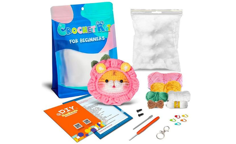 このオールインワンのかぎ針編みスターターキットには、両先かぎ針、段数マーカー、目を付けるための針、あみぐるみの目、柔らかい詰め物、各種毛糸、総合ガイドブック、そしてセット一式を収納できる便利な携帯用ポーチが含まれています。
