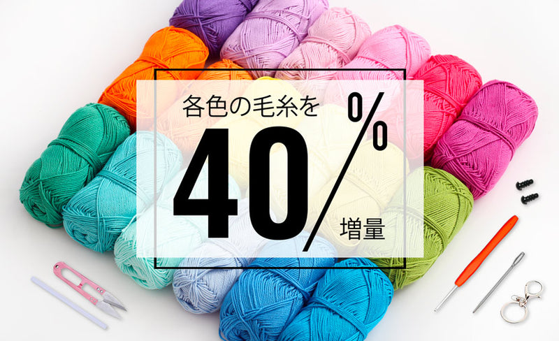 初心者の方でも安心して練習や失敗が修正できるよう、各色の糸を40%増量しています。これにより、毛糸が足りなくなる心配がなくなります。