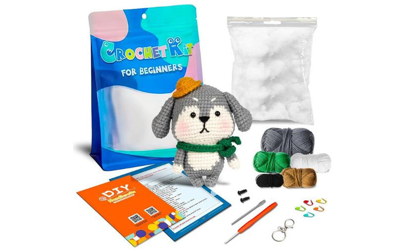このオールインワンのかぎ針編みスターターキットには、両先かぎ針、段数マーカー、目を付けるための針、あみぐるみの目、柔らかい詰め物、各種毛糸、総合ガイドブック、そしてセット一式を収納できる便利な携帯用ポーチが含まれています。