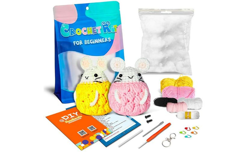 このオールインワンのかぎ針編みスターターキットには、両先かぎ針、段数マーカー、目を付けるための針、あみぐるみの目、柔らかい詰め物、各種毛糸、総合ガイドブック、そしてセット一式を収納できる便利な携帯用ポーチが含まれています。