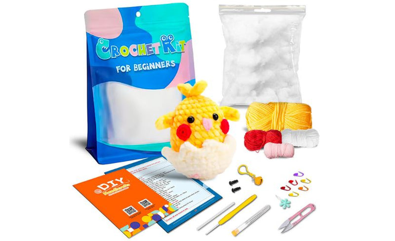 このオールインワンのかぎ針編みスターターキットには、両先かぎ針、段数マーカー、目を付けるための針、あみぐるみの目、柔らかい詰め物、各種毛糸、総合ガイドブック、そしてセット一式を収納できる便利な携帯用ポーチが含まれています。