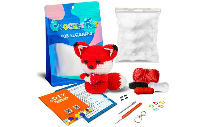 このオールインワンのかぎ針編みスターターキットには、両先かぎ針、段数マーカー、目を付けるための針、あみぐるみの目、柔らかい詰め物、各種毛糸、総合ガイドブック、そしてセット一式を収納できる便利な携帯用ポーチが含まれています。
