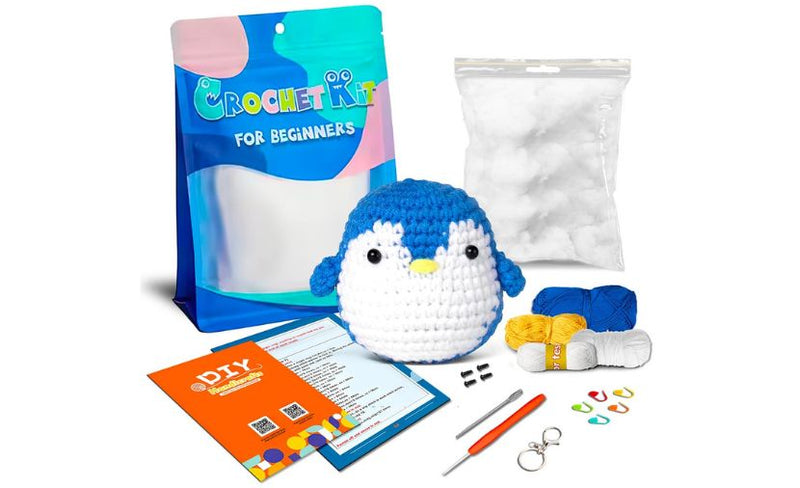 このオールインワンのかぎ針編みスターターキットには、両先かぎ針、段数マーカー、目を付けるための針、あみぐるみの目、柔らかい詰め物、各種毛糸、総合ガイドブック、そしてセット一式を収納できる便利な携帯用ポーチが含まれています。
